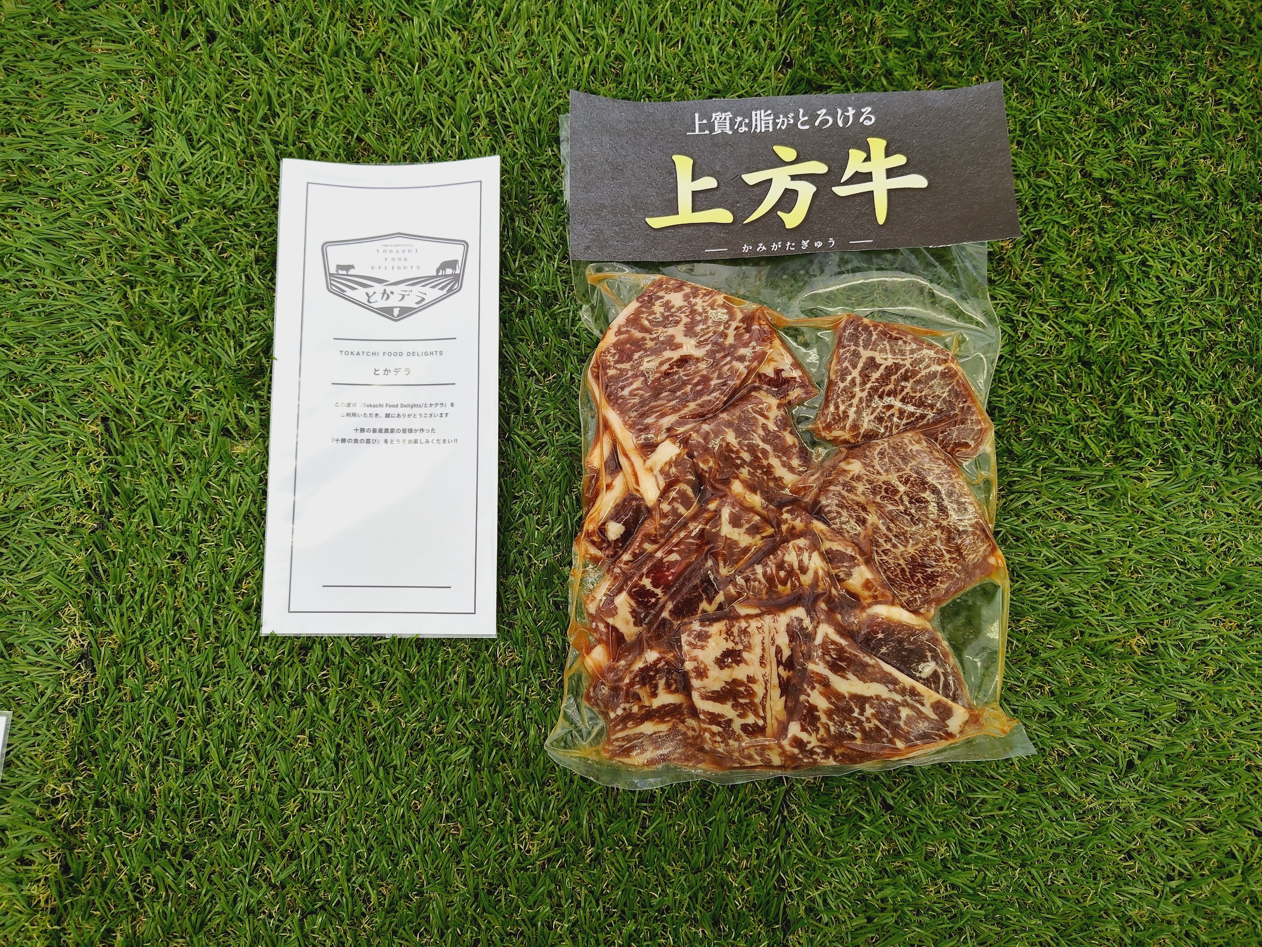 本別町の山奥で、試行錯誤と研究を重ねたこだわりの飼料を食べ、本別町の大地のの湧き水を飲んで育った超希少な黒毛和牛『上方牛』の味付きカルビです。